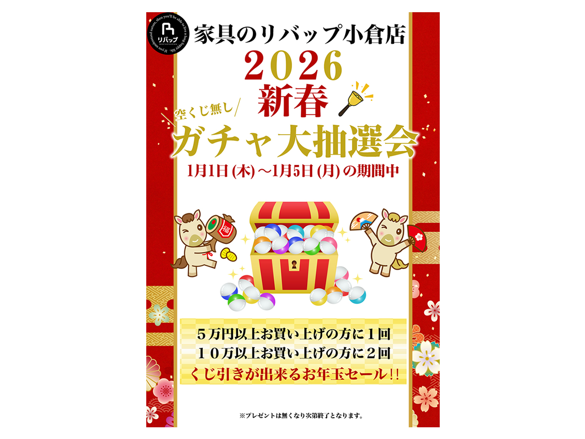 🎍2026年新春ガチャ大抽選会開催!🎍 家具のリバップ小倉店では、2026年の新春を記念して、お得なガチャ大抽選会を開催いたします! [video width="720" he…