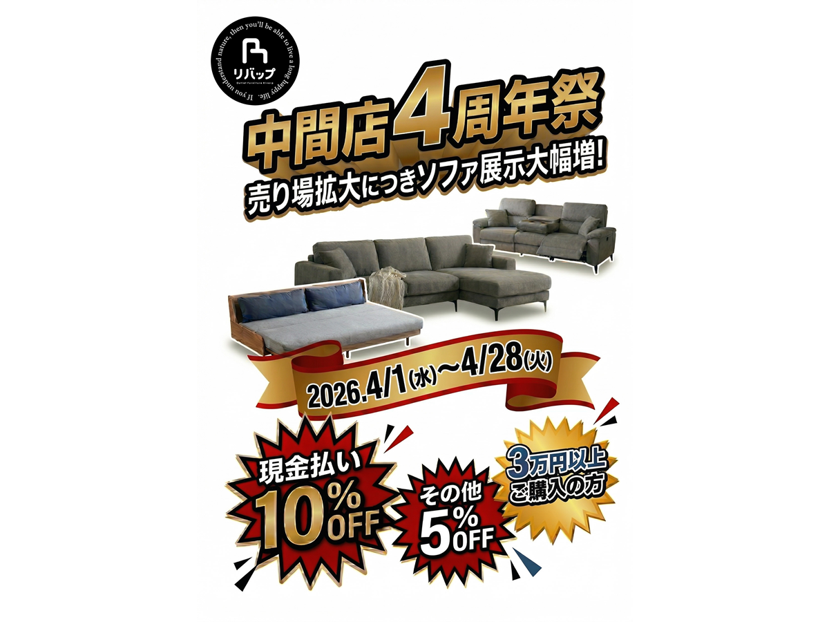 🎉 中間店4周年祭 開催! 🎉 小倉店・直方店でも協賛セール同時開催 日頃より家具のリバップをご愛顧いただき、誠にありがとうございます。…