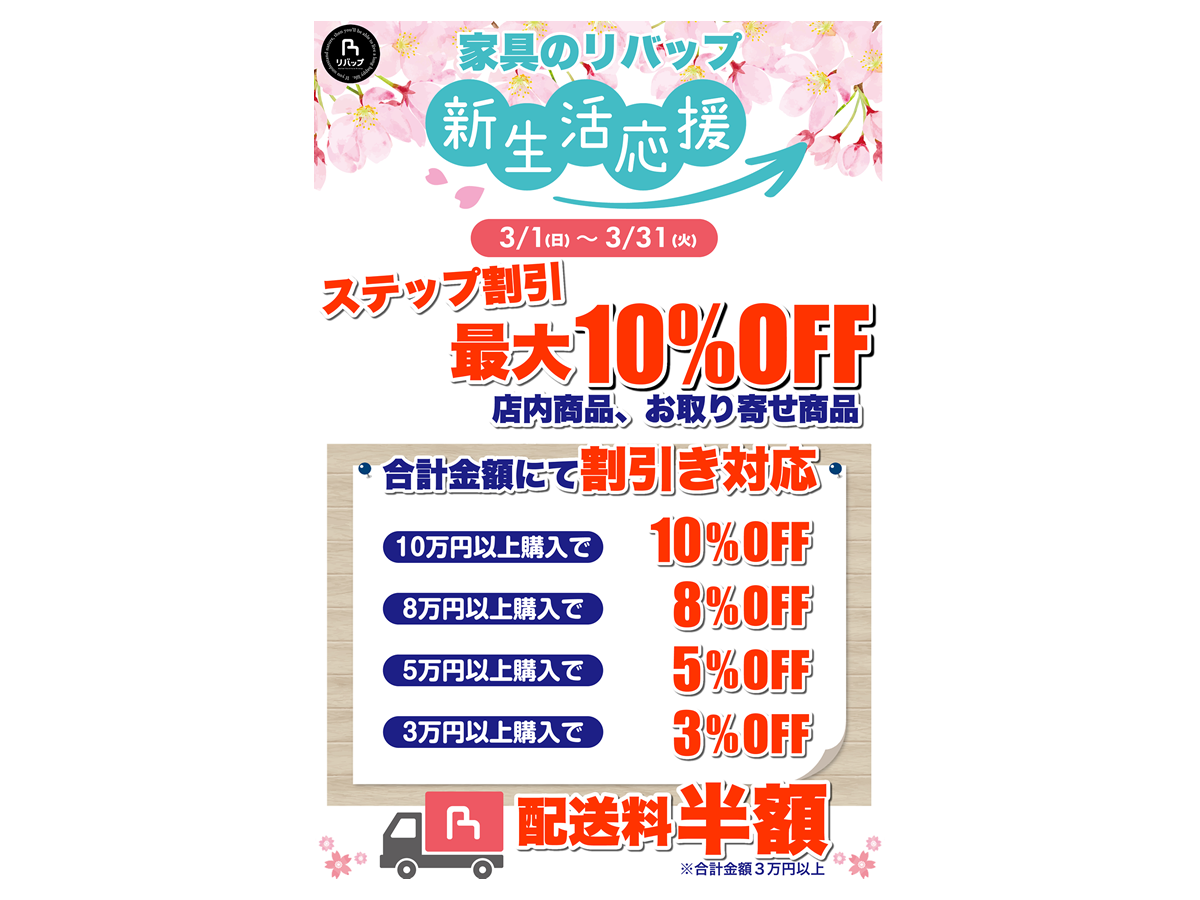 いつも家具のリバップをご利用いただきありがとうございます。 3/1〜3/31の期間、「新生活応援 ステップ割引セール」を開催します! …