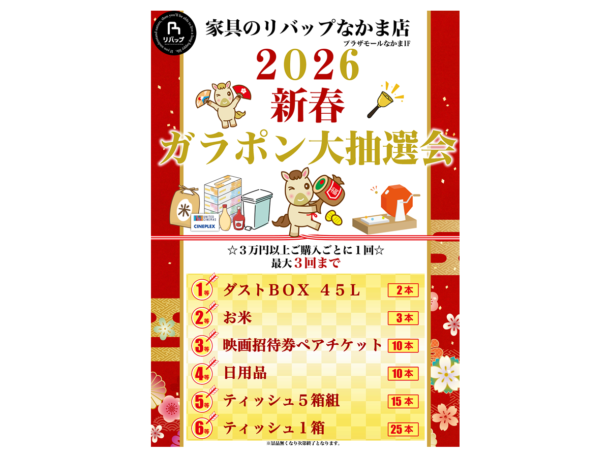 家具のリバップ中間店(プラザモールなかま)では、2026年新春を記念して、豪華賞品が当たる「ガラポン大抽選会」を開催いたします! キャ…